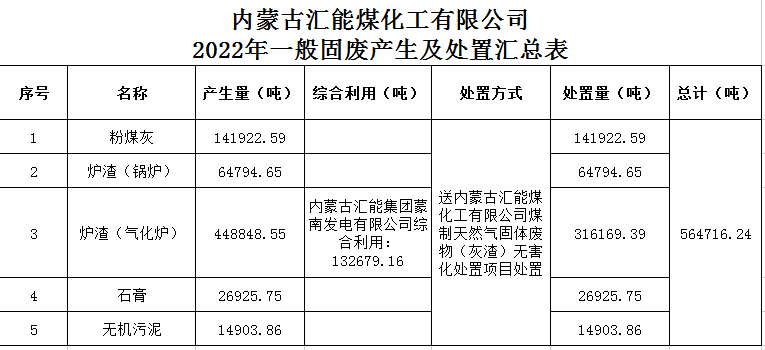 內蒙古匯能煤化工有限公司2022年一般固體廢物信息公示
